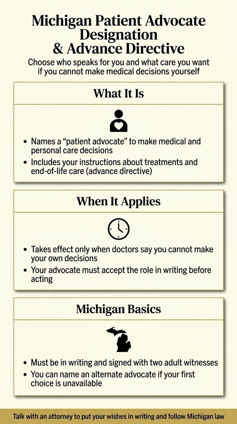 Get Started on a Michigan Durable Financial Power of Attorney and a Michigan Patient Advocate Designation with an Advance Directive. To get started, please complete a short intake form. It usually takes about 5–10 minutes to finish. I will review your information, call you to discuss your plans, and, if I can help, provide a clear fee quote.